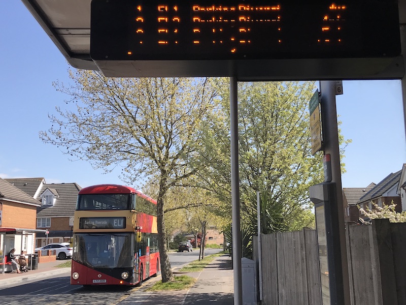 More positively many of the bus shelters have real time information installed, even those close, and in the direction of, the Barking Riverside terminus, where I doubt anyone boards.