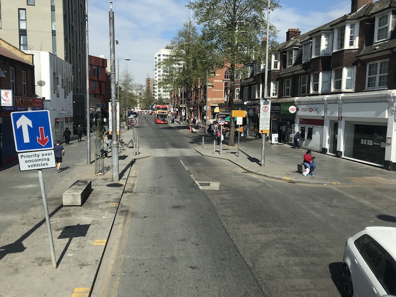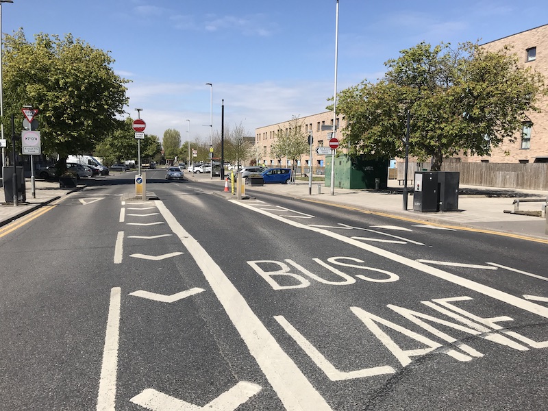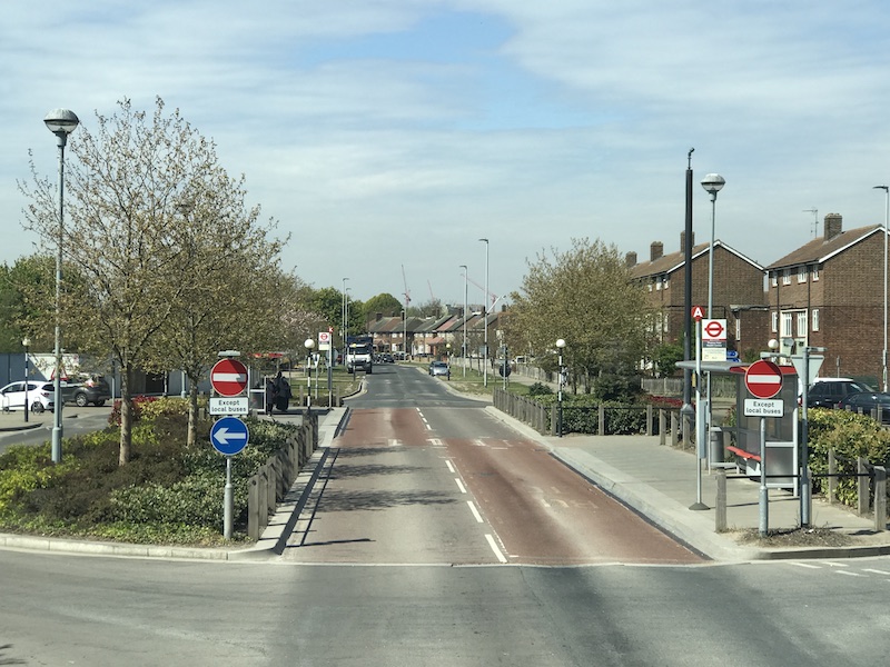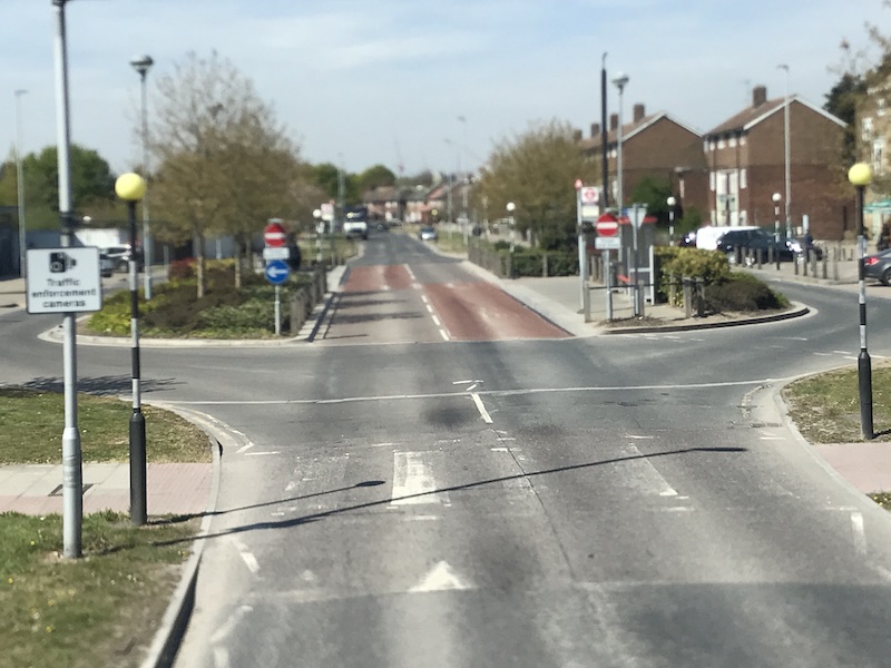 Bastable Avenue has a 7ft width restriction which exempts buses and at the eastern end this is laid out so buses pass through the centre of the road in a short “bus lane” but I son’t see why it’s needed if the width restriction was self enforcing with a camera. It looks good though.