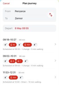 I tried forcing the app to suggest route 16A by asking for a journey from Penzance to Zennor at 08:55 (see above), but even more bizarre, it determinedly kept me on the 16, routing me via St Ives to connect with a journey on the 16A coming out of St Ives towards Zennor arriving at 10:24, 56 minutes after the direct 16A was due there at 09:28. Crazy or what?