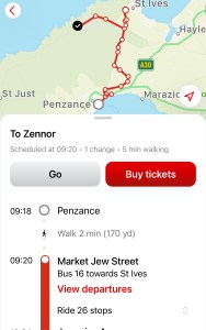 My first intended journey this morning was on route 16A from Penzance to St Ives at 09:00. Luckily I didn’t rely on the app, as even though it’s a wholly TfC funded route, it doesn’t feature in the app, which instead recommends I catch a later journey, at 09:18 on route 16.
