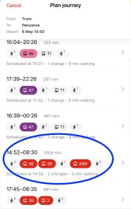 Even more bizarre, the Go Cornwall app, which was developed at public expense amid much fanfare still ignores First Kernow and GWR services. So unwary tourists visiting Cornwall and using the app to help them get around would be given the run around, literally. When asking the app’s journey planner how to travel between Truro and Penzance, for example, it ignores the most obvious options of either the train or route T1 and instead shows journey options involving up to three changes of bus with journey times around 5 hours long, and in one case a journey leaving at 14:52 in the afternoon includes an overnight stay in Cambourne with a total journey time of 17 hours and 38 minutes.
