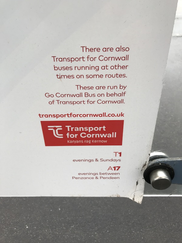 As I got off the train at Camborne Station for the short walk to the bus station I was struck by being passed by three TfC buses departing on other routes all of which I would have missed if I’d needed them, so the network hasn’t quite mastered the promised integration with train timetables yet.