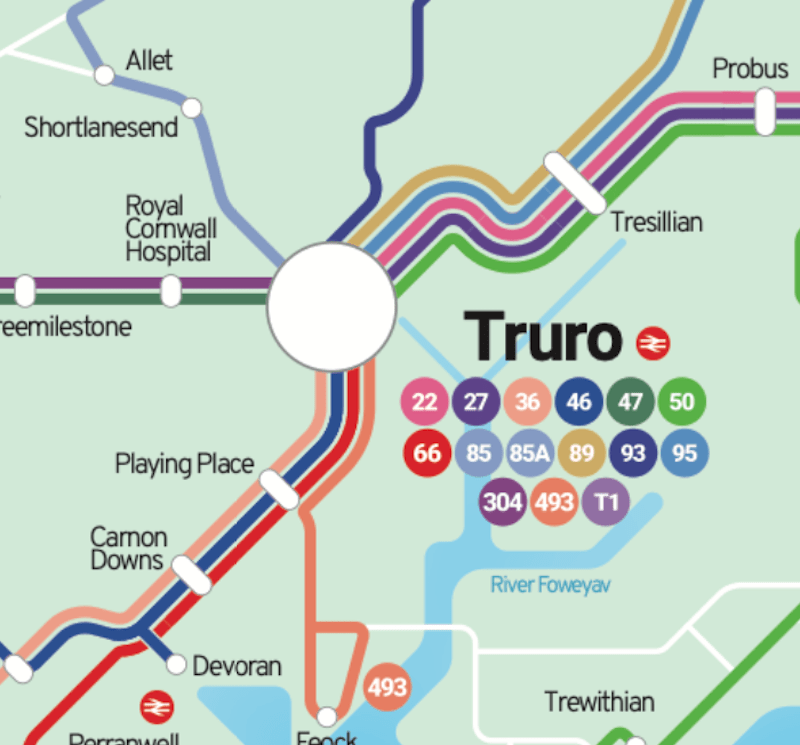 Routes T1 and T2 provide a combined frequency between Truro, Redruth, Cambourne and Hayle, but you’d never know by consulting the Transport for Cornwall map and timetable.