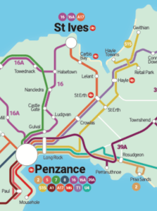 Planning out an itinerary is ostensibly easy to do using the Transport for Cornwall website as it has a bus route listing as well as a colourful countywide network map – something not available when the timetable book was compiled last Spring. The map’s a bit tricky to follow as there are many similar shades of colour making it challenging to work out which route number shown at the terminal points belongs to which coloured line.