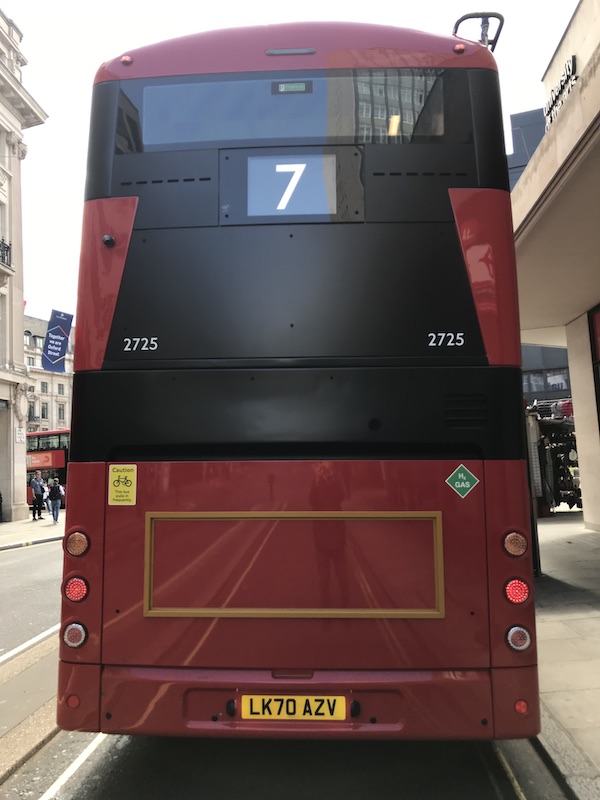 This bus doesn’t even sport the green leaf type foliage vinyls some of the electric and hybrid buses wear in London telling you they’re green buses.