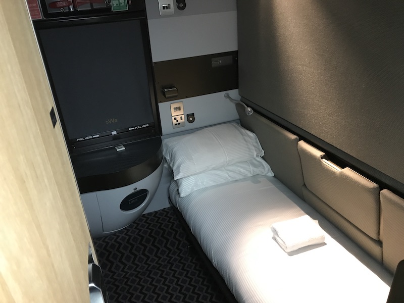 GWR gave its trains a full refurbishment in 2017/18. Out went the rather dated decor and video screens in the cabins which had offered a restricted range of programmes and in came a swish new look with more comfortable beds as well as the all-so-necessary-these-days usb and plug sockets. A policy change also meant no longer would passengers not travelling together share a cabin, with all cabins configured for solo occupancy, or if two people are travelling together, a top bunk is lowered into place to facilitate cabin sharing. Locks operated with a keycard were also incorporated into the berth cabin doors.