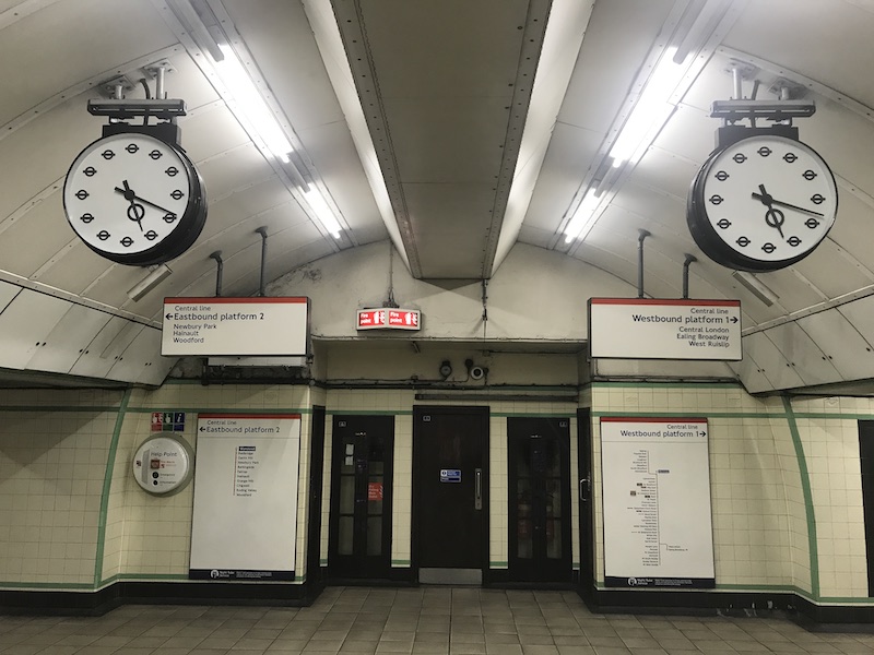 It also has another of the Central Line’s lovely analogue roundel-for -hours platform clocks..