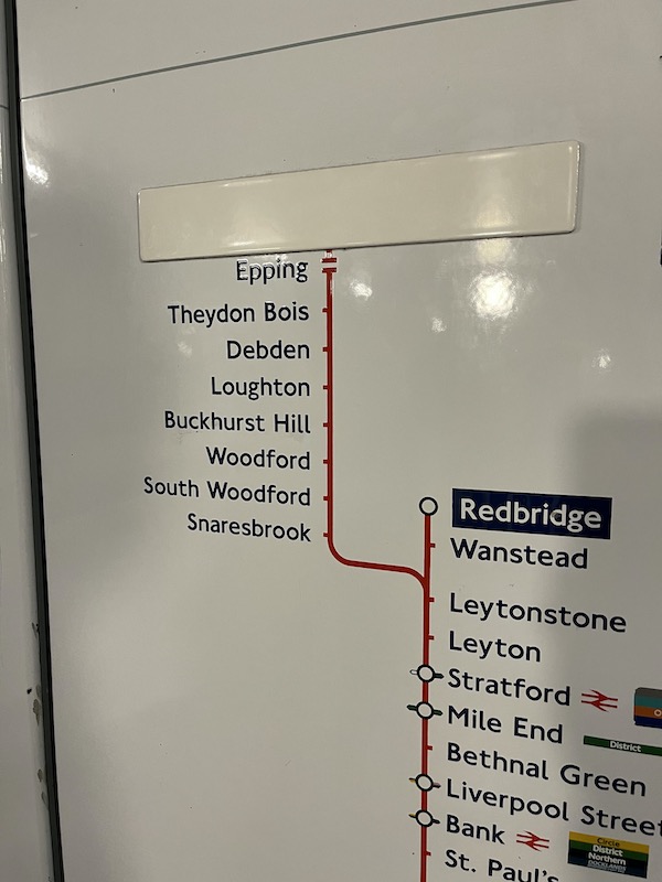 Downstairs on the platforms there’s a throwback to the days when Central Line trains ran beyond the terminus at Epping with North Weald, Blake Hall and Ongar still in situ under the covered panel.