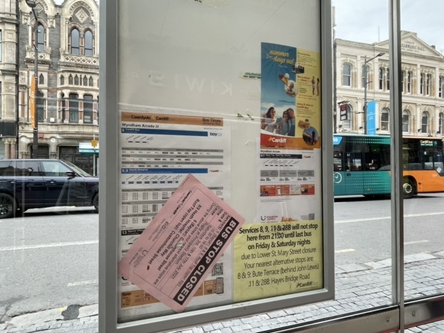 … and in St Mary Street Cardiff had timetables and information posted although the latter also had a rather wonky out of date poster alongside.