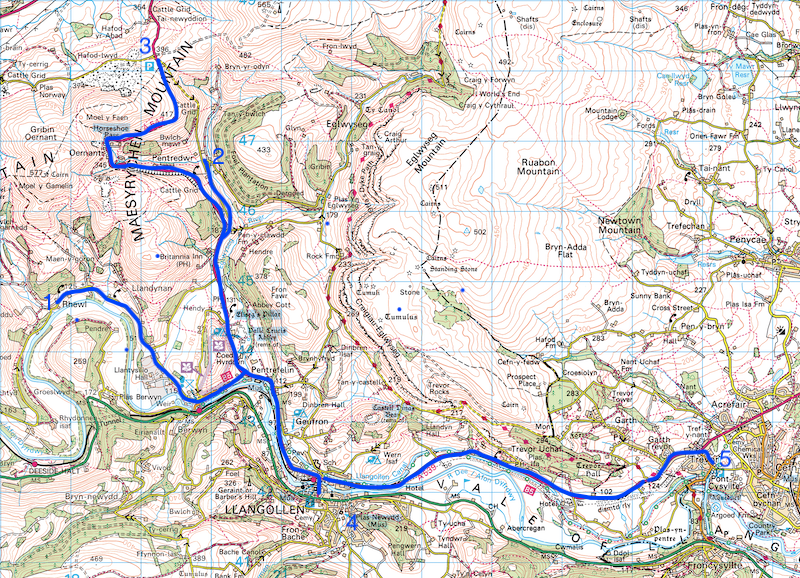 The first prong on each journey is north west of Llangollen to the tiny hamlet of Rhewl (see map above). I understand this is served by an off peak shopping return journey operated by the Council’s Community Bus on two days during the week so these four extra journeys on a Saturday are a real bonus for the handful of people who live here.