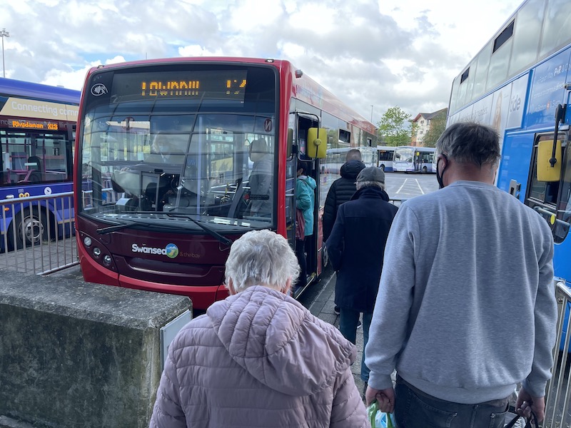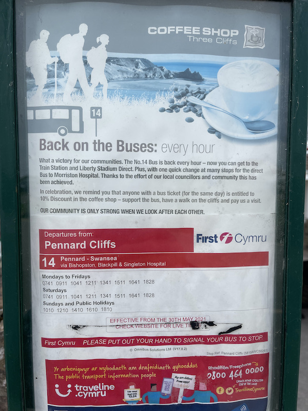 I was interested to see if regular passengers would be aware of the free ride scheme. They weren’t, and were pleasantly surprised when the driver told them, albeit there were only a handful on board, and numbers doubled from Killay when four boarded from what looked like a broken down bus on route 116 which serves the communities in north Gower.