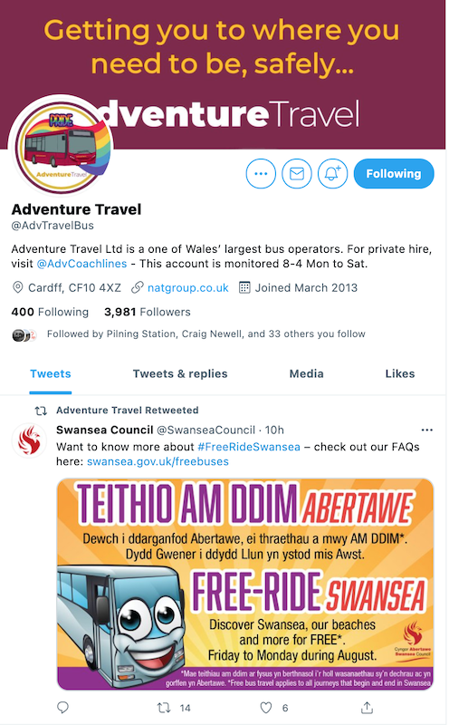 And that in turn was a contrast with Adventure Travel who not only retweeted the Swansea City Council tweet …