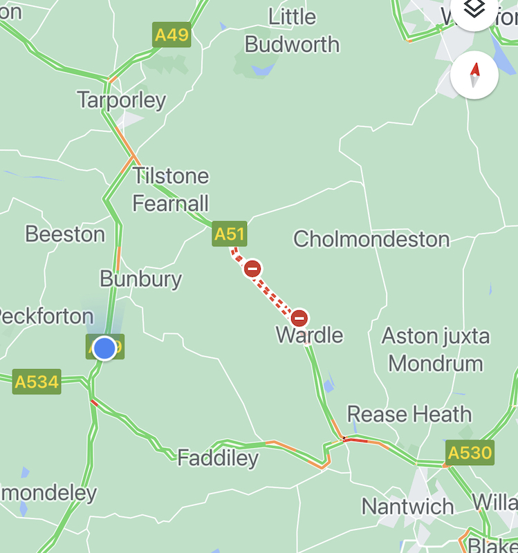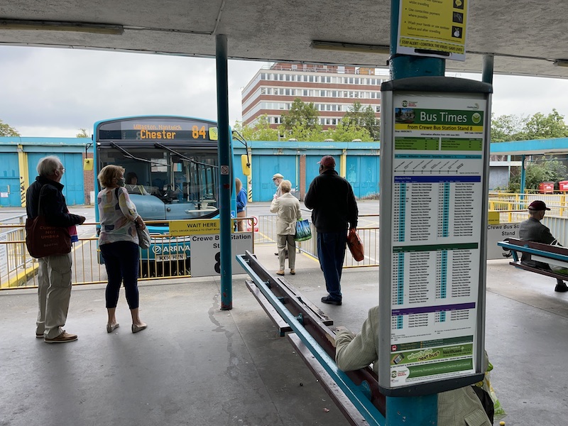 One passenger boarded in Nantwich and then whereas we’d normally head off along the A51 to Chester, that trunk road was closed for roadworks and we embarked on a lengthy detour which helped explain why the bus had arrived into, and left, Crewe ten minutes late.