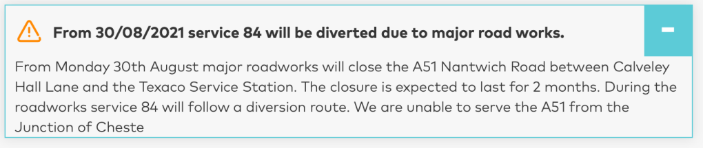 I feel sorry for people living along the closed section of the A51 who’ll have no bus for two months. The screengrab shows the information as it appears online, rather than my poor cutting and pasting.