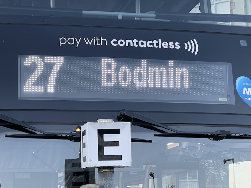 Back to my journey and a shout out to the driver of the 14:15 (not 14:35) St Austell to Bodmin journey on Friday. There was clearly some hiatus going on as I boarded and it turned out a passenger on board had realised she’d left her handbag at the bus stop in the town centre when she boarded the bus. The driver decided to zoom back down there to see if it was still there including doing a u-turn in East Hill but sadly it wasn’t, so then he zoomed back up to the bus station and asked the driver of the FK route 27 bus which had arrived for its 14:25 departure if he’d seen it, but sadly he hadn’t either.