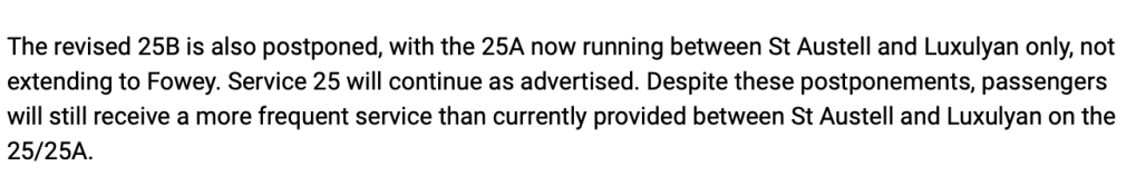 One other Go Cornwall Bus plan was to double its St Austell to Fowey frequency from hourly to half hourly with new 25A/B variants to compete with FK’s commercial hourly route 24. This has also been postponed for lack of staff so it’ll be interesting to see when and if it finally appears.