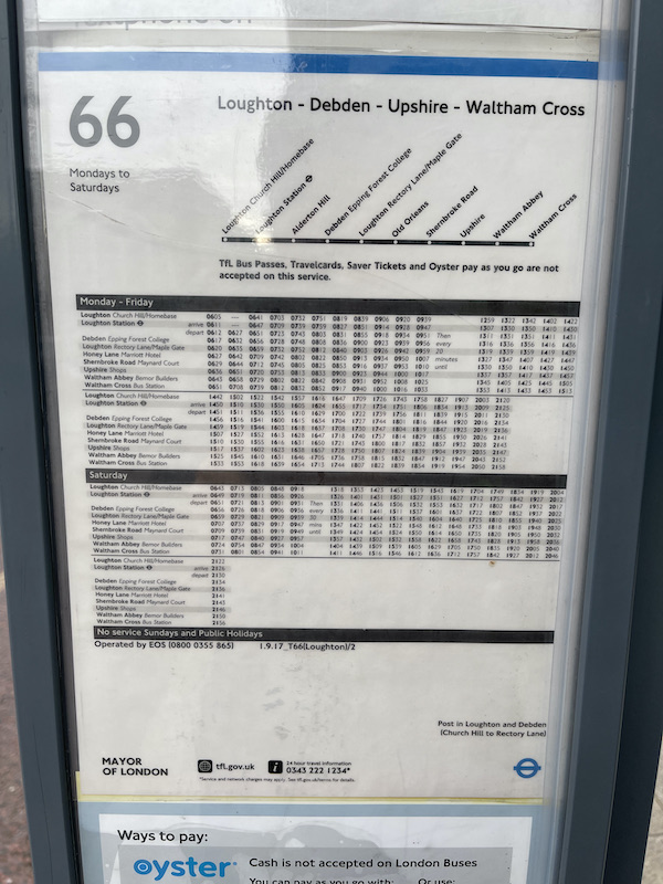From Loughton I took Arriva’s route 66 over to Waltham Cross. This is currently operating to a half hourly frequency on weekdays but a rather inconvenient 45 minute frequency on Saturdays. But it would be no good consulting the at stop information in the TfL timetable case as they seemed to have abrogated any responsibility for posting correct timetables and instead display an ancient timetable dating from 2017 for both the 66 (showing a 20 minute frequency) and 418 (showing incorrect times including the TrustyBus operated evening and Sunday 418B with incorrect times too).