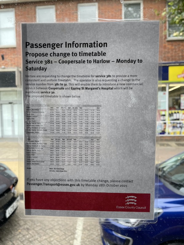 A notice inside the bus on route 13 announced a proposed change to route 381 which would include renumbering to route 31 with a new commercially operated local route between Epping and Coopersale numbered 30 but details of this weren’t included so it’s difficult to comment but it looks as though it will be an improvement.