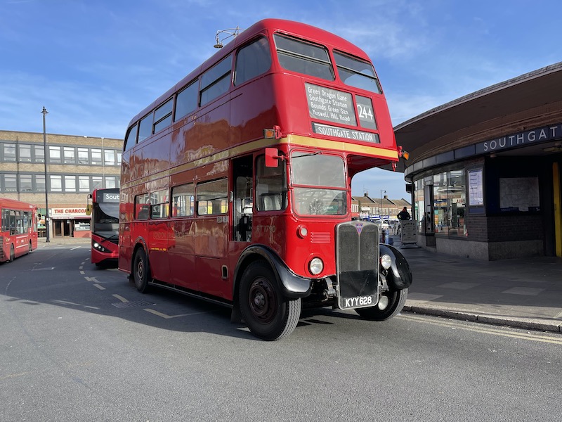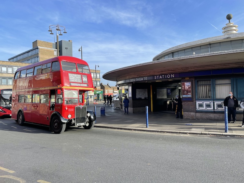 Sadly the RT on route 244 was only going as far as Southgate Station yesterday rather than on to its original terminus at Winchmore Hill but it gave a great opportunity to photograph the iconic RT design bus alongside the iconic Charles Holden designed Underground station on the Piccadilly Line.
