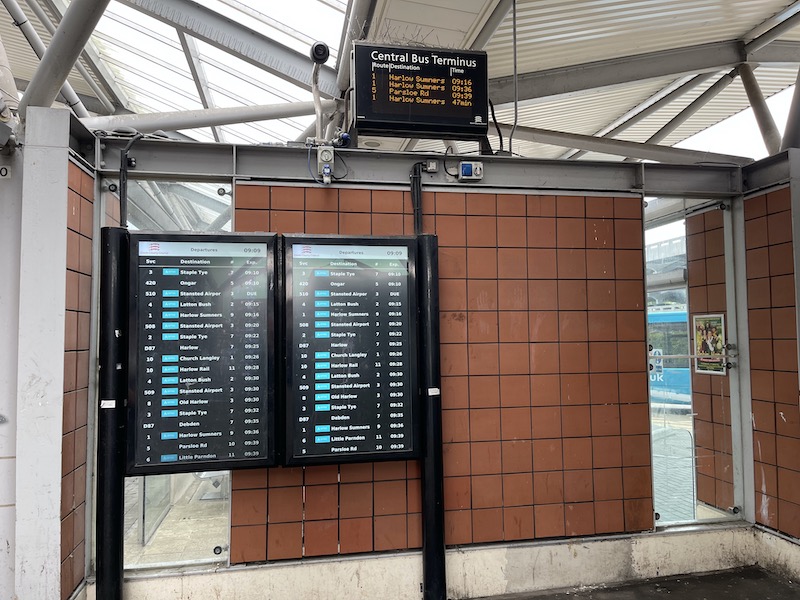 I was imprisoned in Harlow bus station (I daren’t call it an Interchange) a few years ago, when the hourly bus from the east was scheduled to arrive five minutes after the hourly bus to the west left (it still does); and the next daytime driver to the west, who’d had half an hour added to his schedules for peak time delays, had a better idea, to add it to his layover time at Harlow, so my bus left 45m late. (I’ve found better ways of doing the journey since, not involving buses).
