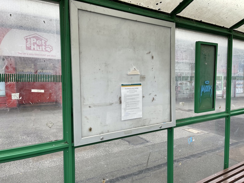 1. Putting up unofficial information about bus times is a very well intentioned thing to do, especially if the official information is out of date or missing. However, if it is stuck on to perspex panels, they sometimes have to be replaced. It’s surprising how easy it is to damage a perspex panel, having to robustly clean off Cellotape at the roadside can leave the panel scuffed, rendering it useless. Not very sustainable, financially or otherwise. Surely contacting the relevant team at the council is the way to go?