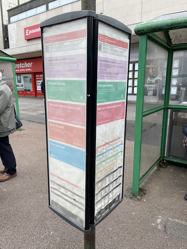Where timetables are displayed in cases by the shelters at bus bays 11 and 12 in the open air they’re designed so that the actual departure times are shown at the very bottom below waist height – ideal for a small child to view but no good for any adult who has to bend down to try and see them.