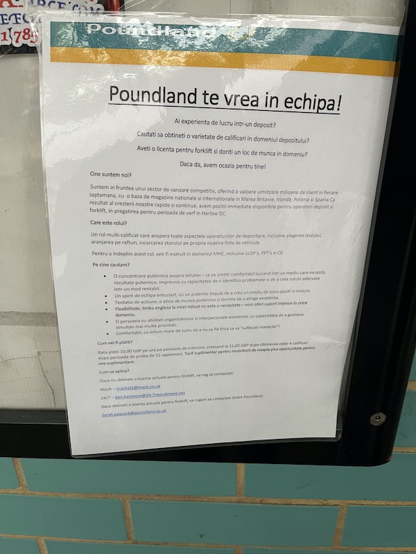 This time it was Poundland advertising in Romanian for staff, well so Google translates tells me is what it’s saying.