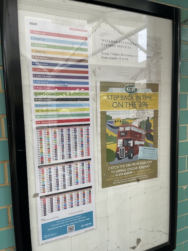 3. Waist high timetables were surely part of Essex CC’s drive to make public transport fully accessible to passengers in wheelchairs? No help at all to wheelchair users or ambulant passengers if they’re so woefully out of date. Much as I now bemoan local authorities (not to mention West Yorkshire CA by name) who have removed every vestige of timetables from our streets, I suppose that a waist high QR code is ok for wheelchair users and children with iPhones?