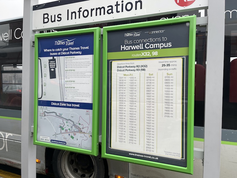 Also, impressively, these are well advertised with departure lists at the bus stops at Didcot Parkway as well as at each bus stop through Milton Park.