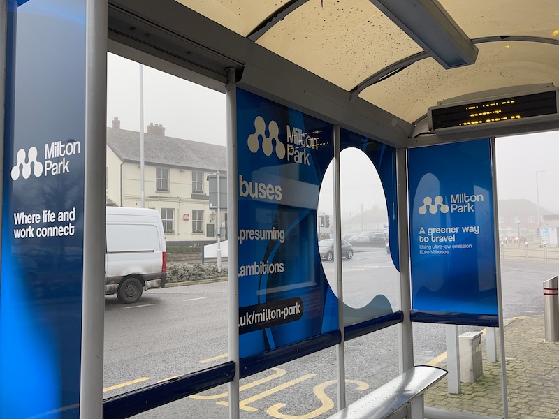 The Milton Park blue branding is applied to the bus shelters at Didcot Parkway as well as on road signs and buildings throughout the business park itself.