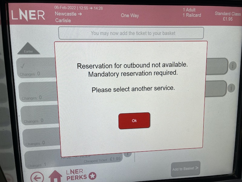 Except when I pressed the £1.95 icon it came back with the message “Reservation for outbound not available. Mandatory reservation required, Please select another service”.