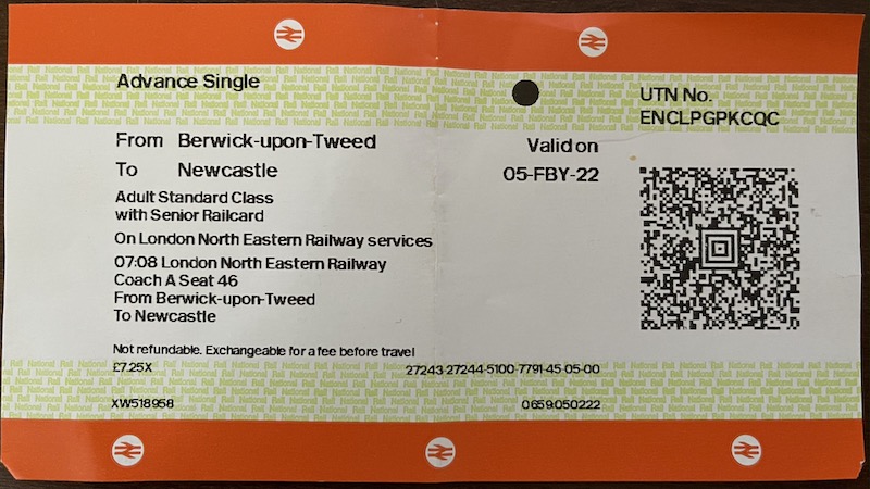 Next morning, Saturday, I travelled from Berwick-upon-Tweed to Newcastle. The woman in the ticket office again asked if I was travelling “now” and offered me a £7.25 single on the 07:08 LNER departure.