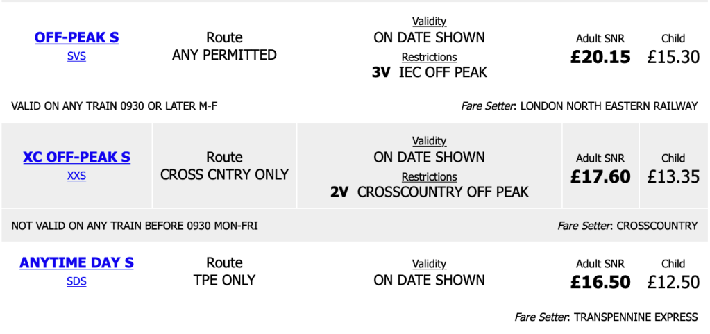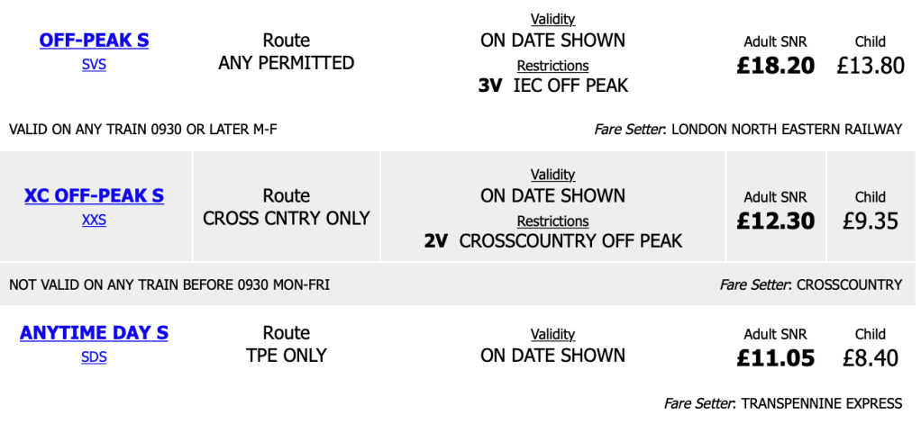 There’s advance purchase, anytime singles, anytime returns, anytime day singles, anytime day returns, first class, standard class, off-peak day travelcard, off-peak day single, off-peak day return, super off-peak day travelcard, super off-peak day return, paper tickets, smartcard tickets, railcard discounts, but not for all fares, weekly seasons, monthly seasons, annual seasons…I could go on!