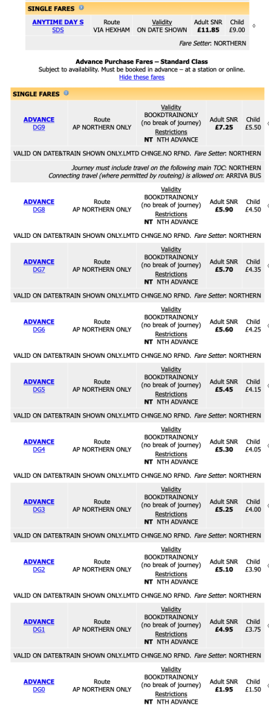 What a crazy situation. If you look on the helpful brfares.com website there’s a full list of all the different “Advance Single” fares available between Newcastle and Carlisle on Northern’s trains.