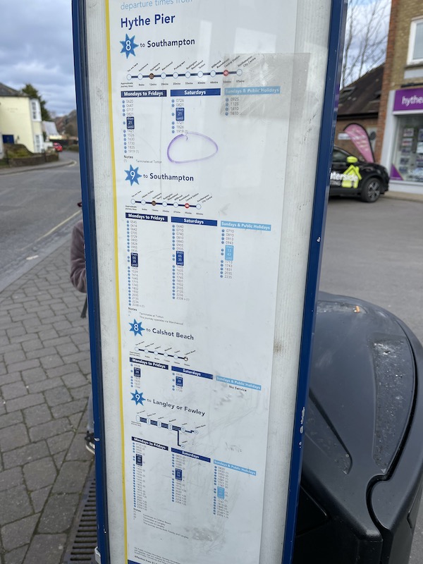 Except that contrary to the information in the leaflet and at the bus stop display, Bluestar routes 8 and 9 are currently running what I assume is a Covid inspired reduced timetable. Route 9 is now the route for both Fawley and Calshot (hourly) as well as Langley Farm (hourly) with route 8 only running hourly between Southampton and Hythe.