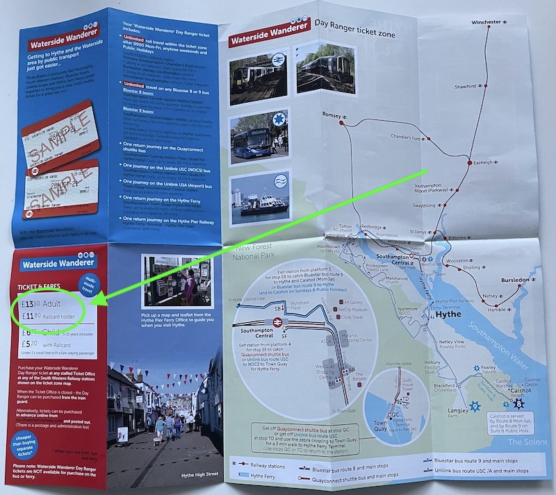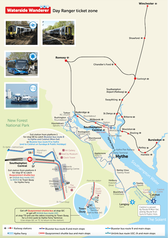The ticket gives unlimited travel on SWR trains (as well as CrossCountry and GWR) in an area stretching from Winchester in the north across to Romsey in the west and down to Bursledon in the south east alongside the north bank of Southampton Water as well as on Bluestar’s bus routes 8 and 9 between Southampton and Hythe and on to Fawley, Calshot and Langley Farm on the south side of Southampton Water skirting the eastern edge of the New Forest.