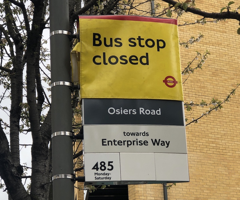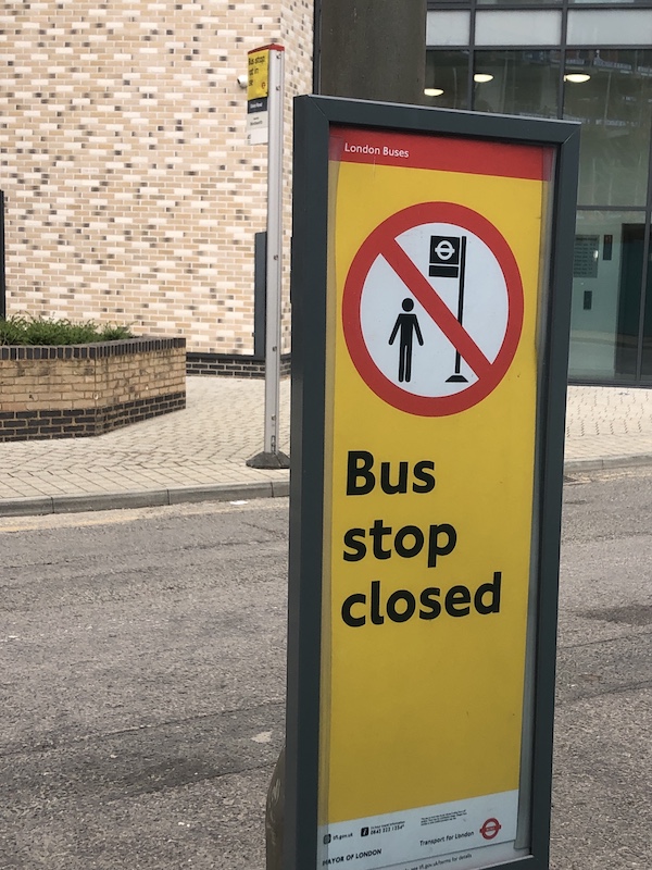 Except they didn’t. Instead, after my blog was published the contractors returned and covered over the bus stop flags as well as inserting ‘Bus stop closed’ signs in the timetable cases which only added to the consternation among residents.