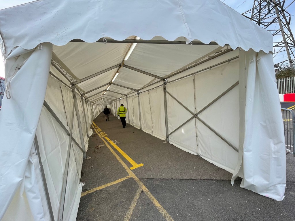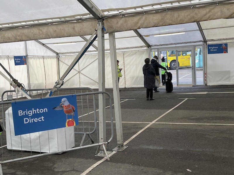 I also noticed passengers spotting a bus with, for example, a ‘Brighton Direct’ paper destination in the windscreen, deviating from the official trajectory into the covered walkway to see if they would be let on board while the bus is waiting to cross the crossing. I didn’t see any drivers opening doors to let them on and high-viz people soon told them to head into the covered walkway to the marquee departure point.