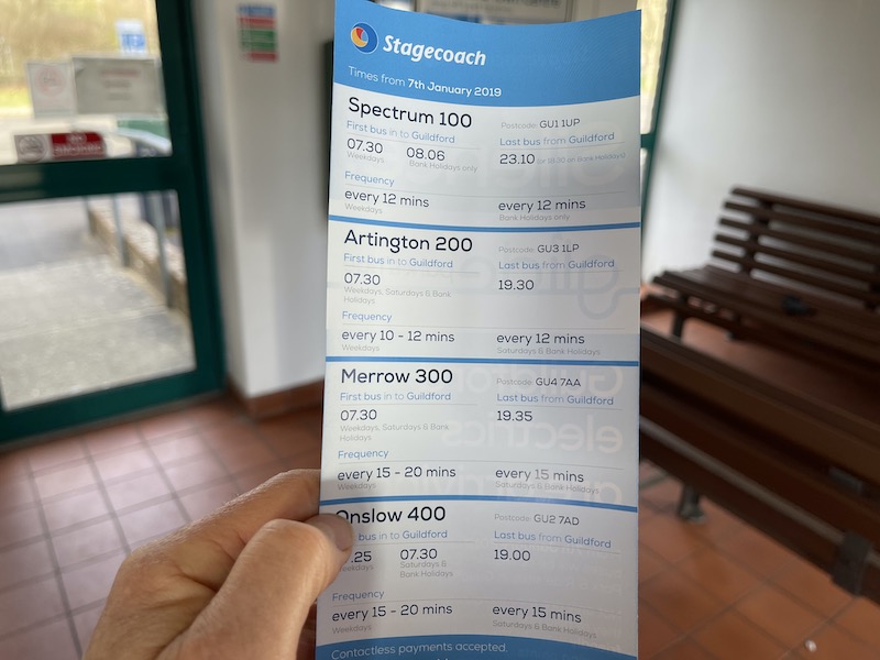 You did not mention the new Surrey timetable book, which is very creditable . But you have to know where to find it.-, in the tourist office in High Street or from a Compass driver in my case. Stagecoach drivers could carry a few – why not? Essentially Stagecoach must reopen their offices if they want to get passengers back.