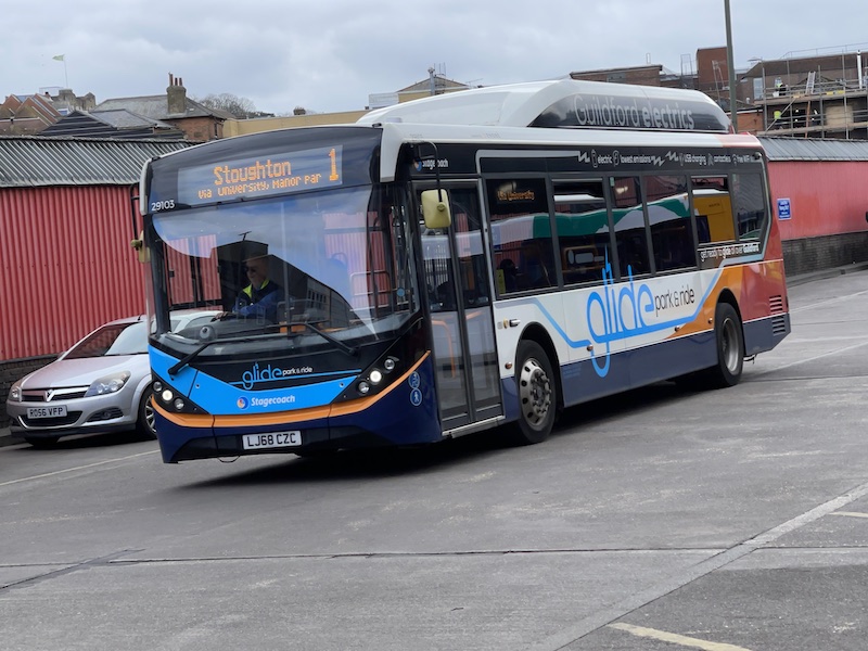 Route 1 continues to the west and north of the town centre as it’s done since the 2018 changes to serve the Manor Park, the County Hospital and the University of Surrey returning via Stoughton direct to the town centre as a route 2 with buses running both ways around the circuit supplemented by half hourly shorts to the University.
