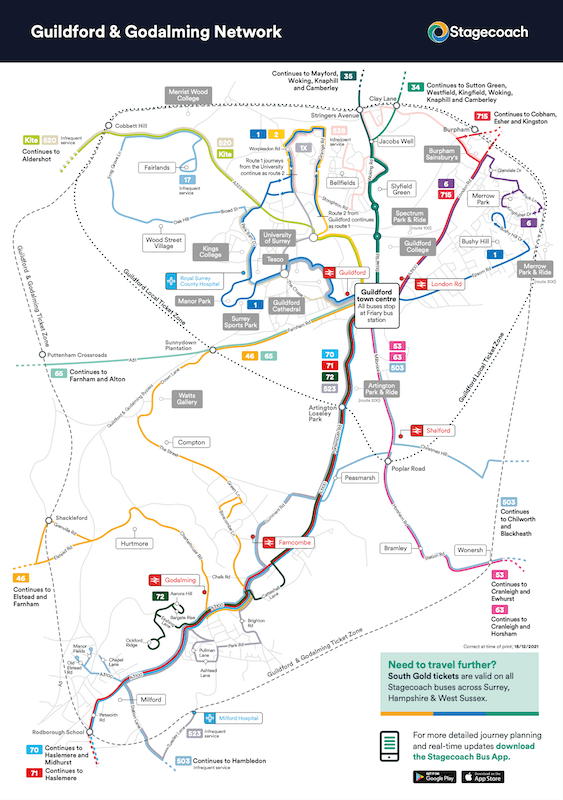 Inter-urban routes to Horsham, Woking and Epsom have continued very much the same but route patterns have changed on Guildford’s town network and some frequencies have reduced although this is more a reflection of a short term shortages of drivers.
