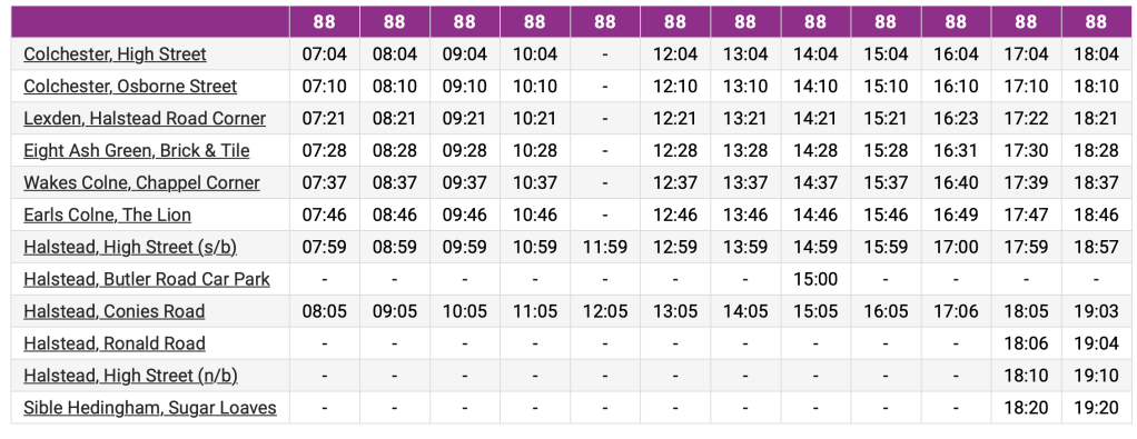 Heddingham’s buses leave Colchester Osborne Street at 10 minutes past the hour also taking 55 minutes to Halstead returning at 08 minutes past the hour.