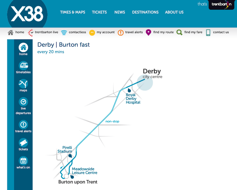 This fast route taking just 35 minutes uses the A38 linking Derby and Burton-on-Trent running to a twenty minute frequency and operated by TrentBarton and Arriva.