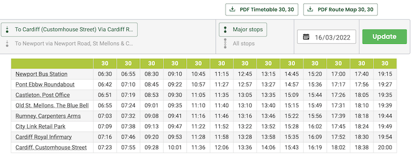 Operated by Cardiff Bus and Newport Bus on a half-hourly frequency, it’s unfortunate the timetable shown on the Newport Bus website only shows its own buses with 90 minute gaps where Cardiff Bus buses run – you need to know to click on the “PDF Timetable” icon to get the full jointly run timetable.