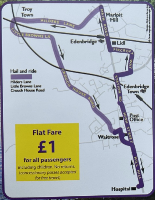 Shame about the Edenbridge E1, but – presumably as a fill-in-between-school-trips – it doesn’t offer much more than a morning shopping service to part of the town (Edenbr.total pop. 8,000), plus hospital visits. It does connect reasonably with the 236 to/from Westerham, to give 3 hours there, and similarly with the trains to/from Oxted (3 hours) and Croydon (2 hours+). Did you notice any leaflets publicising these travel opportunities?