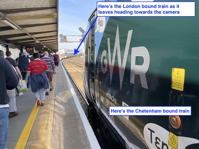 The elongated platform is called both platform 1 and 2 either side of the station’s pedestrian entrance/exit by the gate line and my Cheltenham bound train used the far eastern end (platform 1) while a London Paddington bound train was pulling away from the western end (platform 2) – both being five coach IETs.