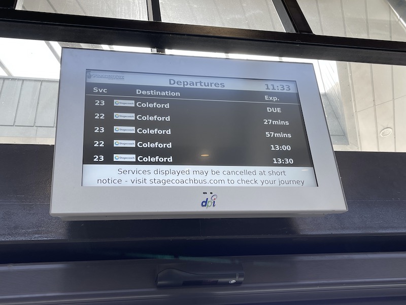 I’d planned to catch the 11:30 departure on route 23 from Gloucester – the route interworks with the hourly route 22 sharing a common route as far as Westbury-on-Severn before the latter takes a more central route to Coleford through Cinderford and the Forest of Dean itself. My bus was due in from its previous journey at 11:20, but 11:30 came and went with no sign of it. However I took heart from the fact a driver was waiting by Stand G where we were due to leave from and the real time sign above the door still showed the bus as “due” at 11:33.