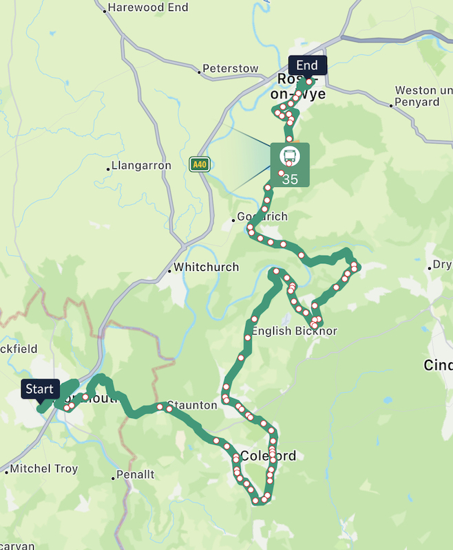 The route takes a rather circuitous trajectory and we followed all points of the compass at different times on the journey – heading south, when Ross-on-Wye is due north of Coleford.