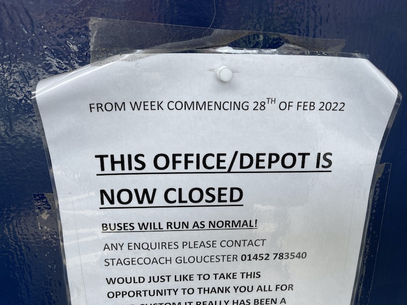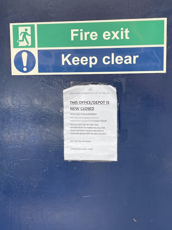 The office in Ross was a true survivor. In truth, it was the admin/canteen for drivers but with the ability to walk in and get a leaflet, back in the day. With the closure of Ross depot in favour of relocating routes to either the Milkwall outstation or main Gloucester depot, it finally went.