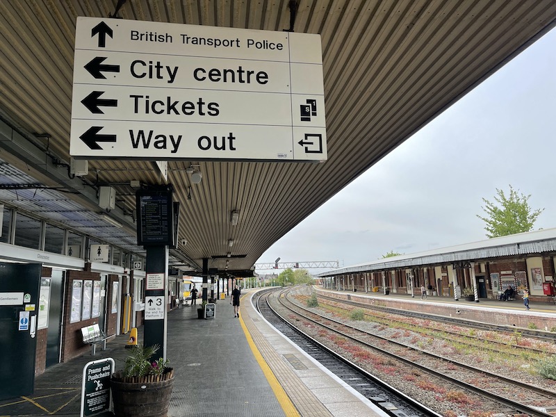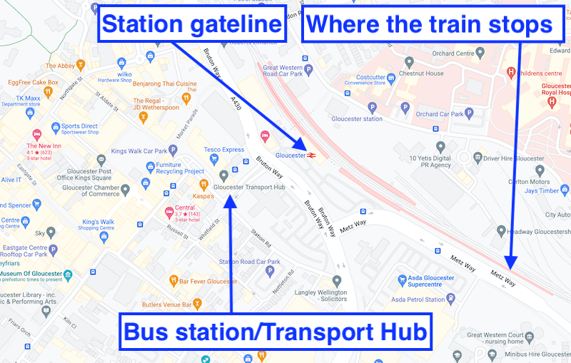 On the upside, Gloucester’s relatively new bus station (sorry, Transport Hub) is just a stone’s throw from the railway station – actually the bus bays are much closer to the station gate line than where trains stop on that platform in the station!